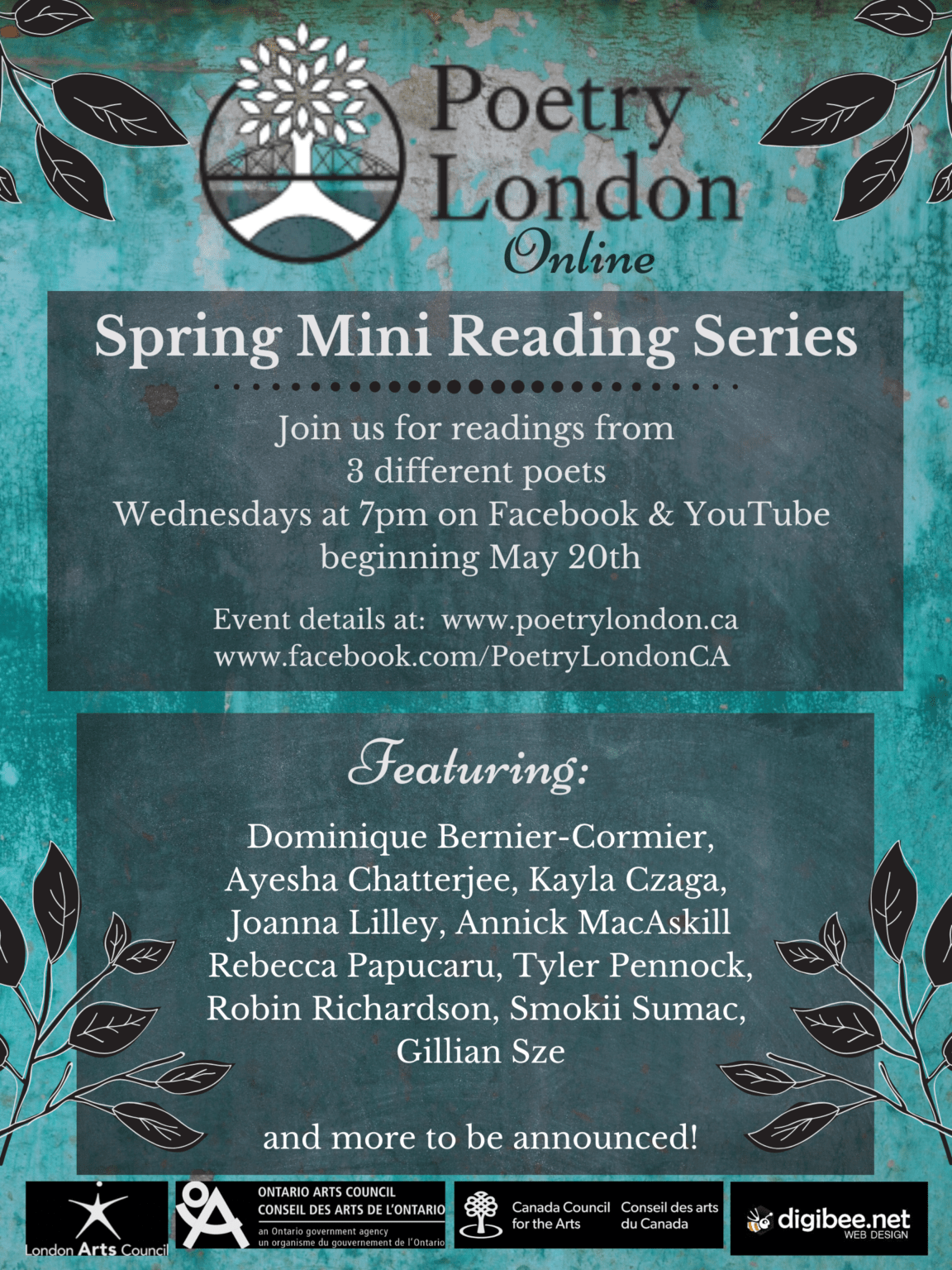 Announcing their “spring project: a multi-week online mini reading series featuring poets from across Canada!” Video posts will happen on Wednesdays at 7:00pm starting on May 20th.